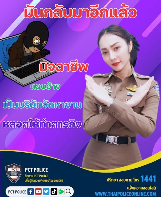 มันกลับมาอีกแล้ว มิจฉาชีพแอบอ้างเป็นพนักงานบริษัทจัดหางาน ที่ผู้เสียหายติดต่อสมัครงาน เมื่อเหยื